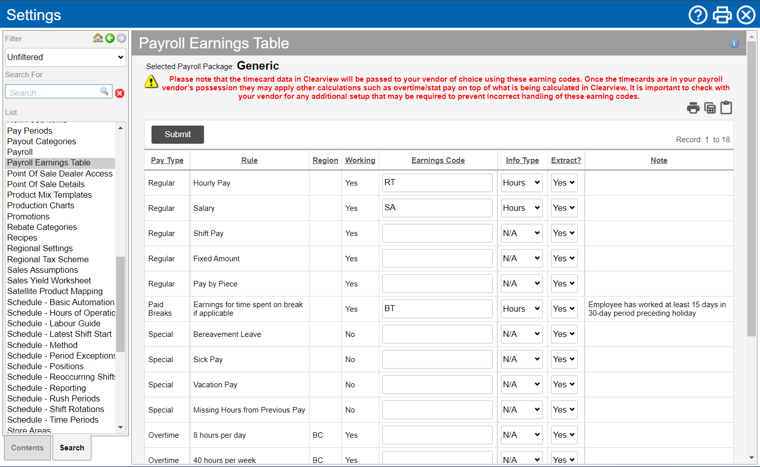 The Payroll Earnings Table lets you map the various pay types to the corresponding earnings code in your payroll app The application or software used by your organization to manage payroll.. The table includes all pay types that can be created in CLEARVIEW, and you only need to map the pay types you intend to use.