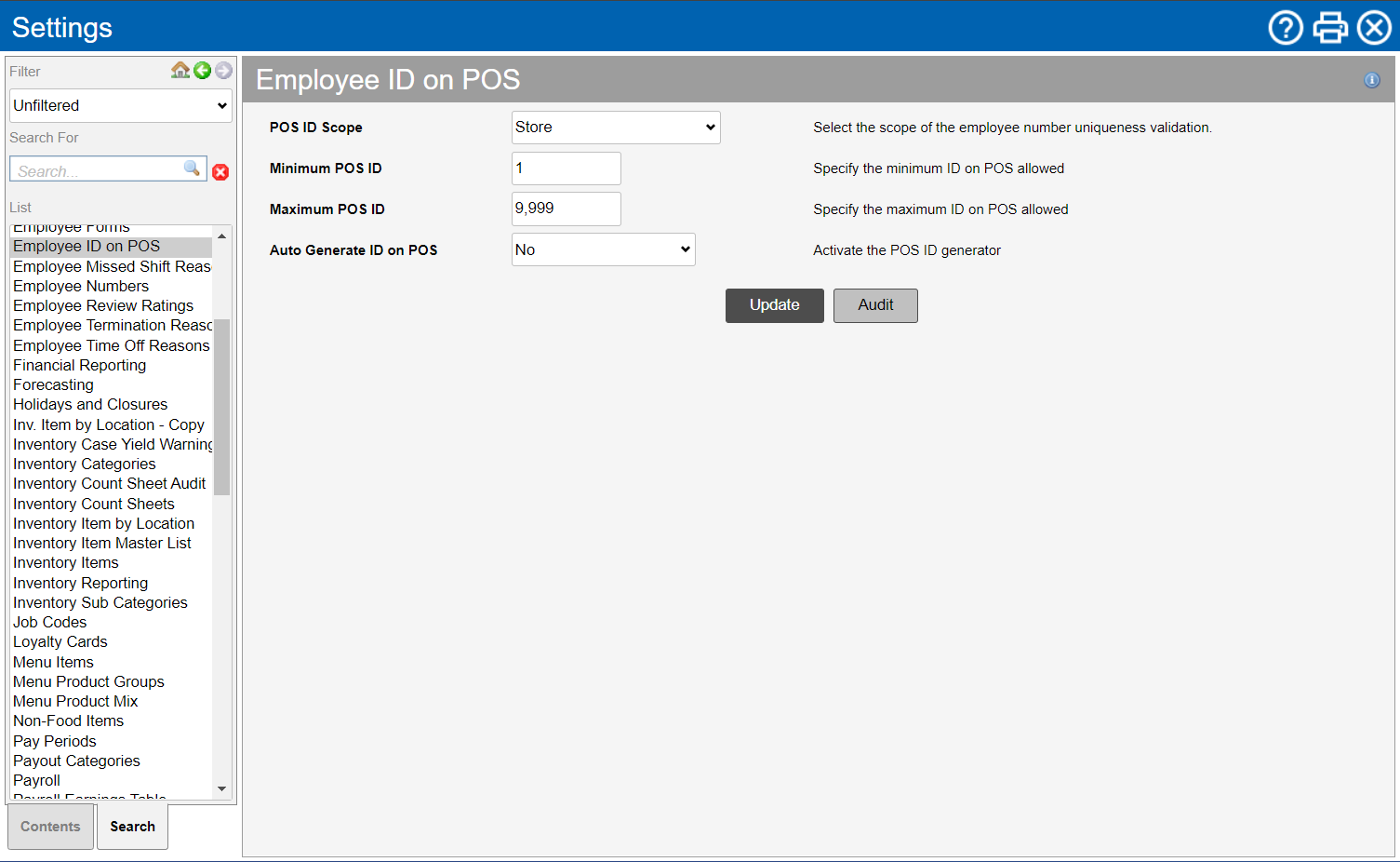 Employee ID on POS is used to map the ID used on your POS system Point Of Sale system - the system/register used to bill customers and track sales. to the electronic employee file in CLEARVIEW so that time cards received from your POS are recorded correctly in CLEARVIEW. This setting defines the constraints of the IDs on the POS, while the actual mapping will need to be done later in the employee file.